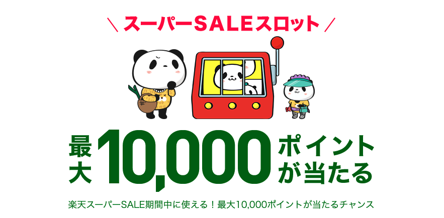 2021年3月4日(木)19:59までに事前エントリーすると、抽選で、楽天スーパーSALE期間中に使える最大10,000ポイント(期間限定ポイント)がもらえるキャンペーンを実施中! 誰でも当選チャンスがありますので、楽天スーパーセール開始前にエントリーすることをおすすめします。 「スロットに挑戦する」ボタンに進んでみてくださいね。