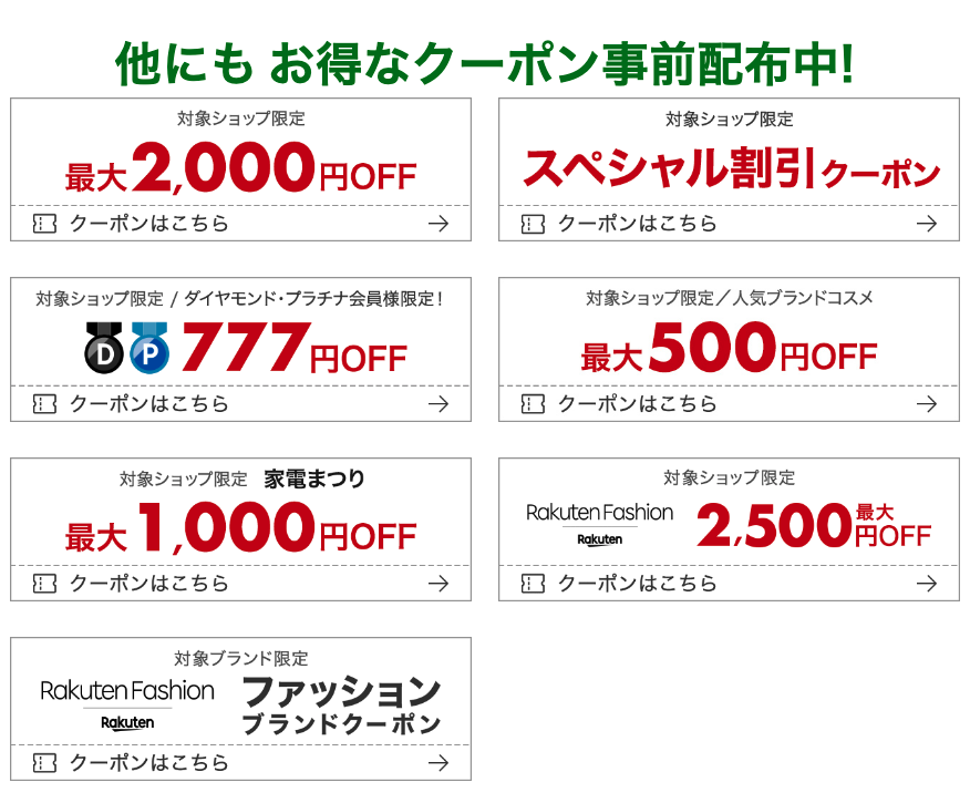 万が一、楽天スーパーセール開始前にゲットできなくても、開催中に獲得できるものもありますのでクーポンをじゃんじゃん活用しましょう。