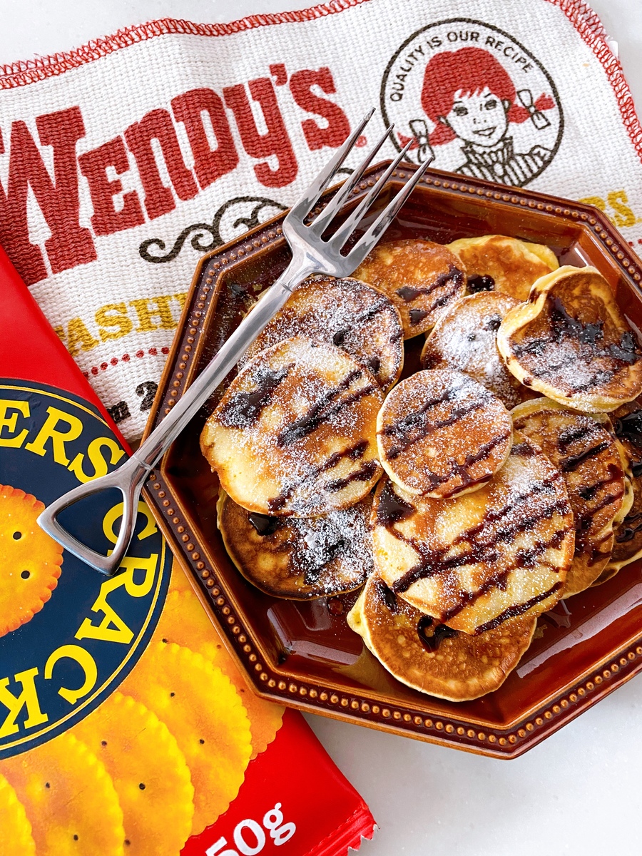 パンケーキにササっと粉砂糖を。 降ると降らないとでは、全然映え方も違いますね。