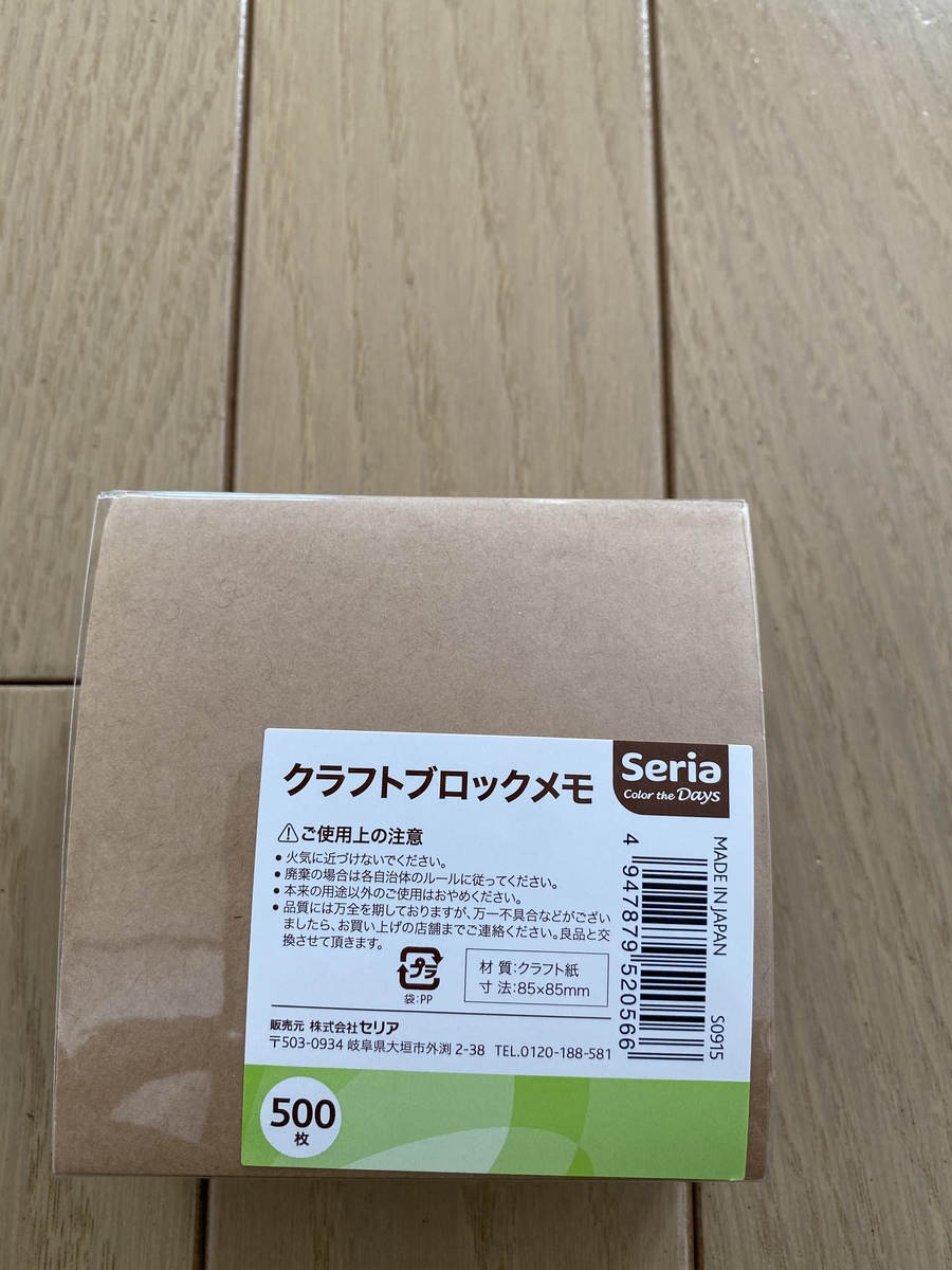 セリア印の日本製。 8.5×8.5cmで、なんと500枚もあります。 メモ帳500枚ってすごい枚数ですよね。