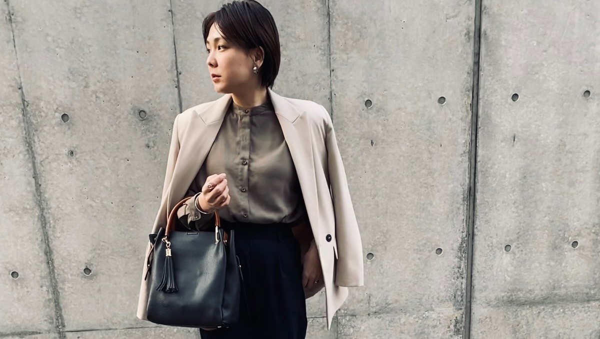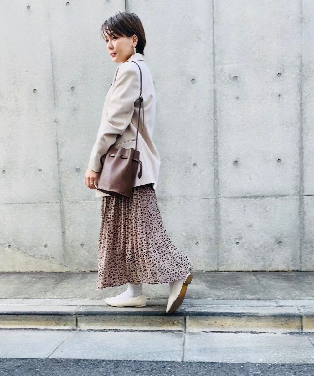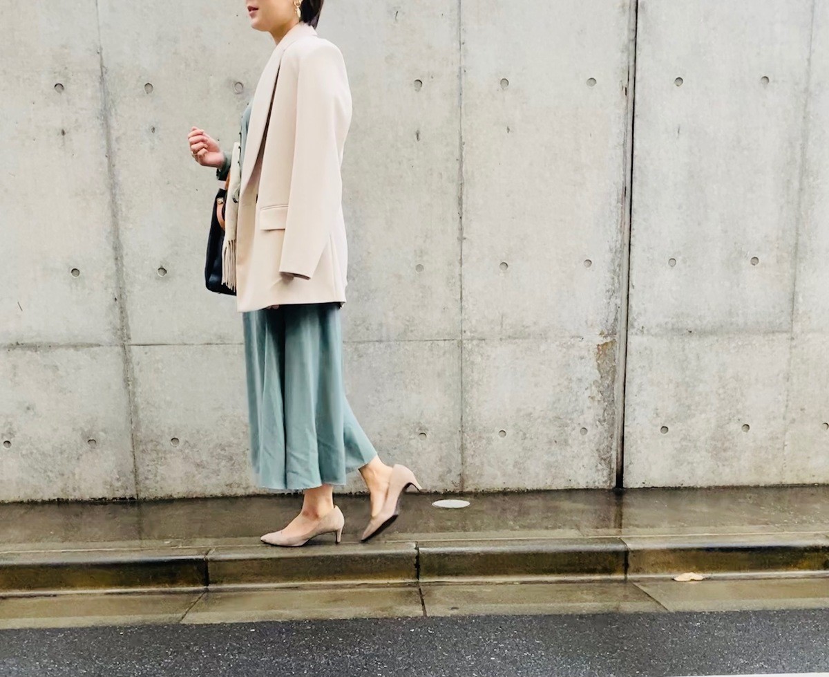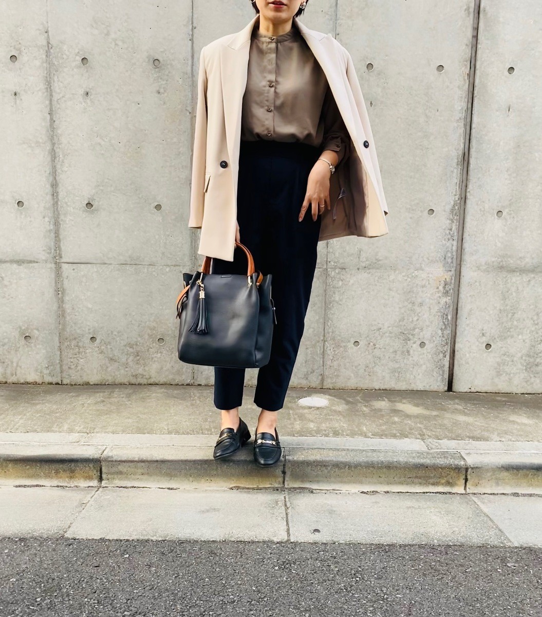 柔らかなブラウスで女性らしさもあり、バランスのいいスタイリング。 くすみ系のブラウスは、顔までくすんでしまう?と不安な方もいるかと思いますが、ジャケットのベージュが肌を明るく見せてくれるので心配なし。