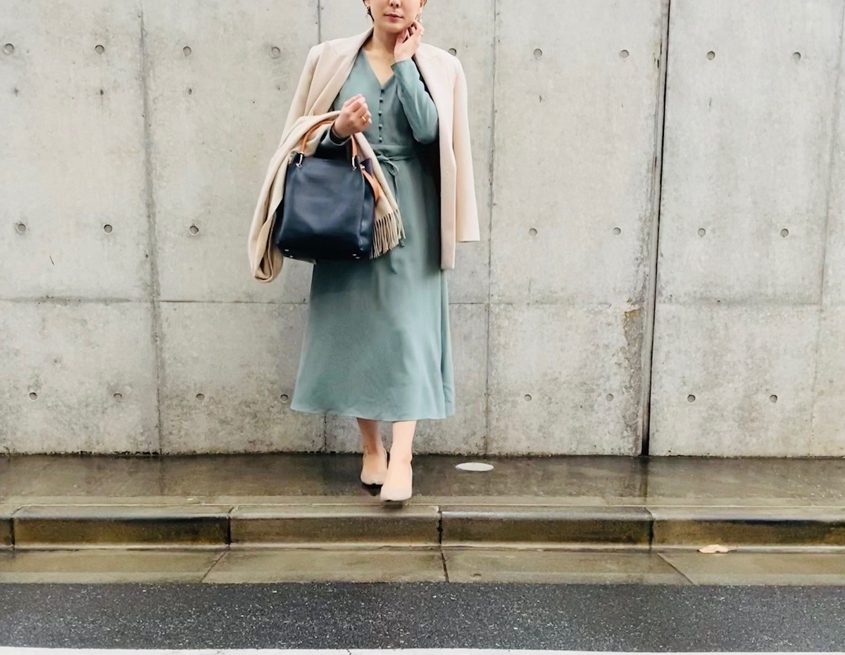 ワンピースはダスティーなグリーンなので可愛くなりすぎず、落ち着きはありつつも華やかさがあるちょうどいいスタイル。
