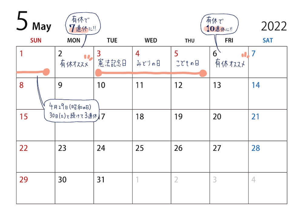 年に1度のチャンスだから、もっとゆっくり休みたい場合は5月2日と5月6日に有給を取得すれば10連休にすることが可能です。