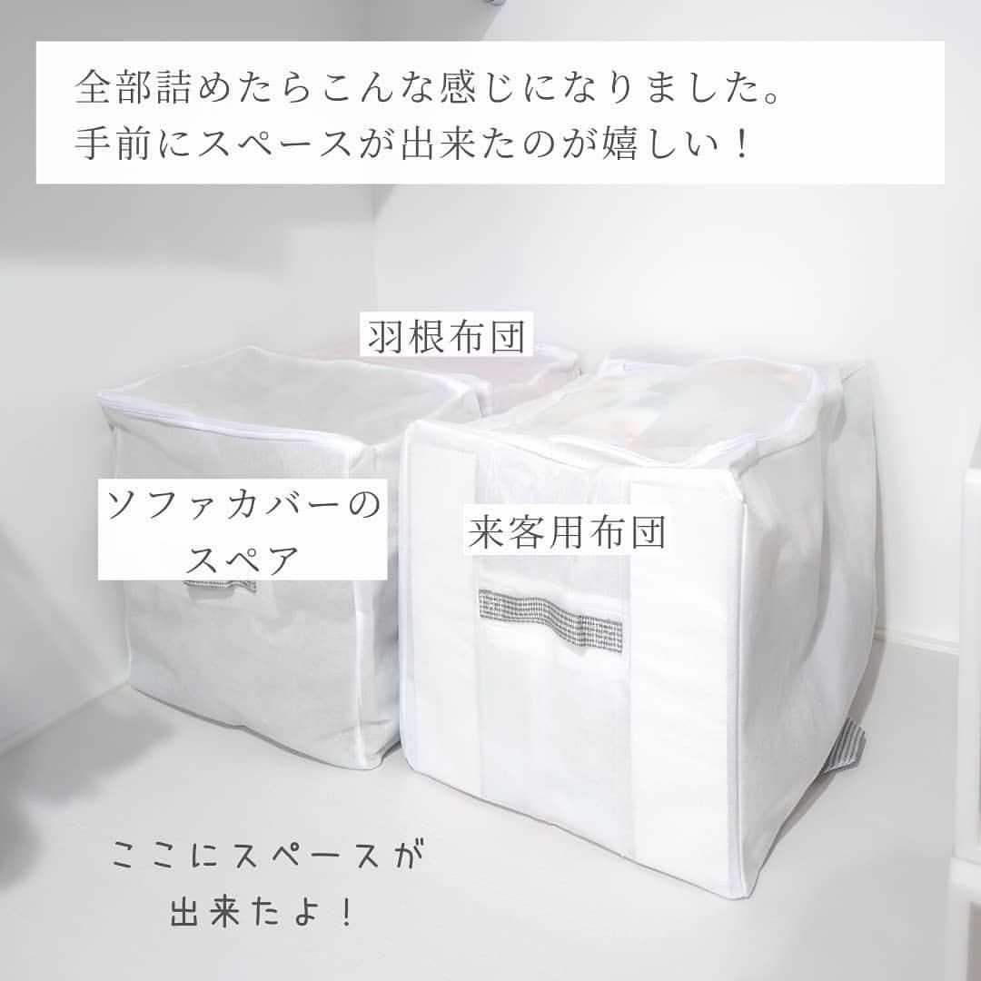 今まで大きな収納袋を使用していた@pom_myhomeさん。棚上収納袋3つを使い、収納スペースを広げる事に成功です!