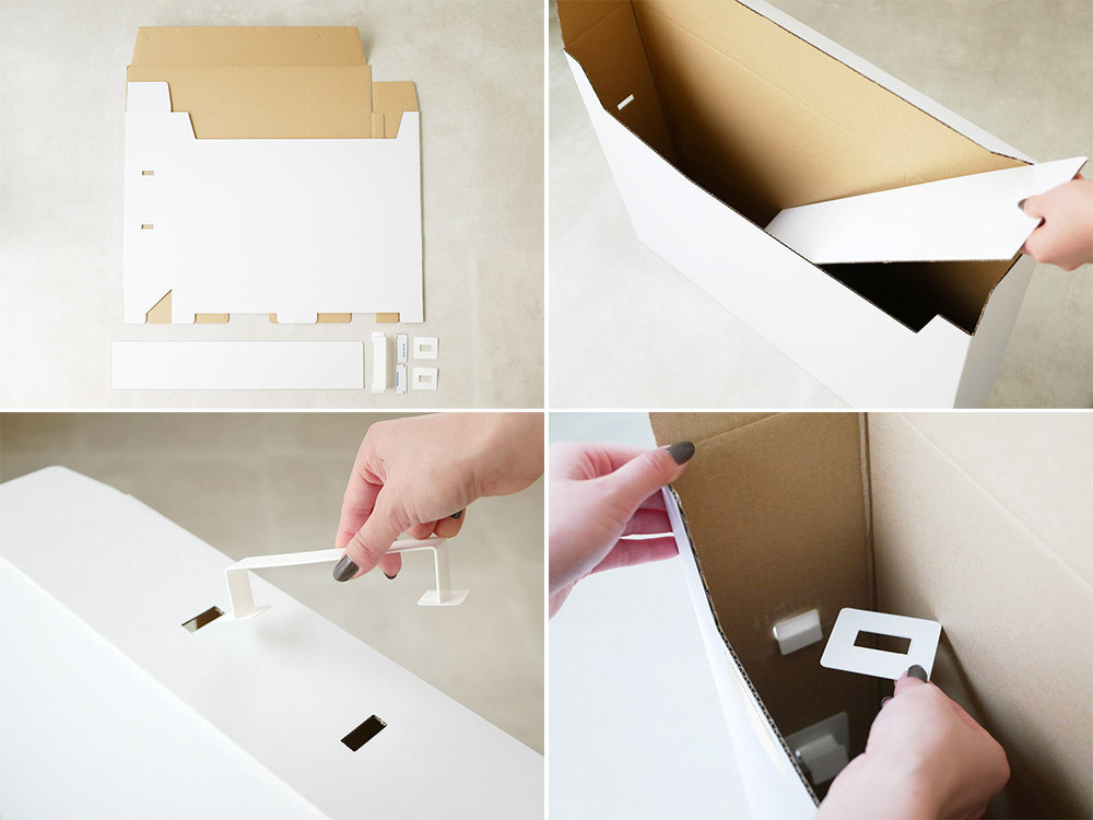 2.取っ手を取り付ける。 (※取っ手を取り付ける際は、差し込み口の紙が破けないようご注意ください。)
