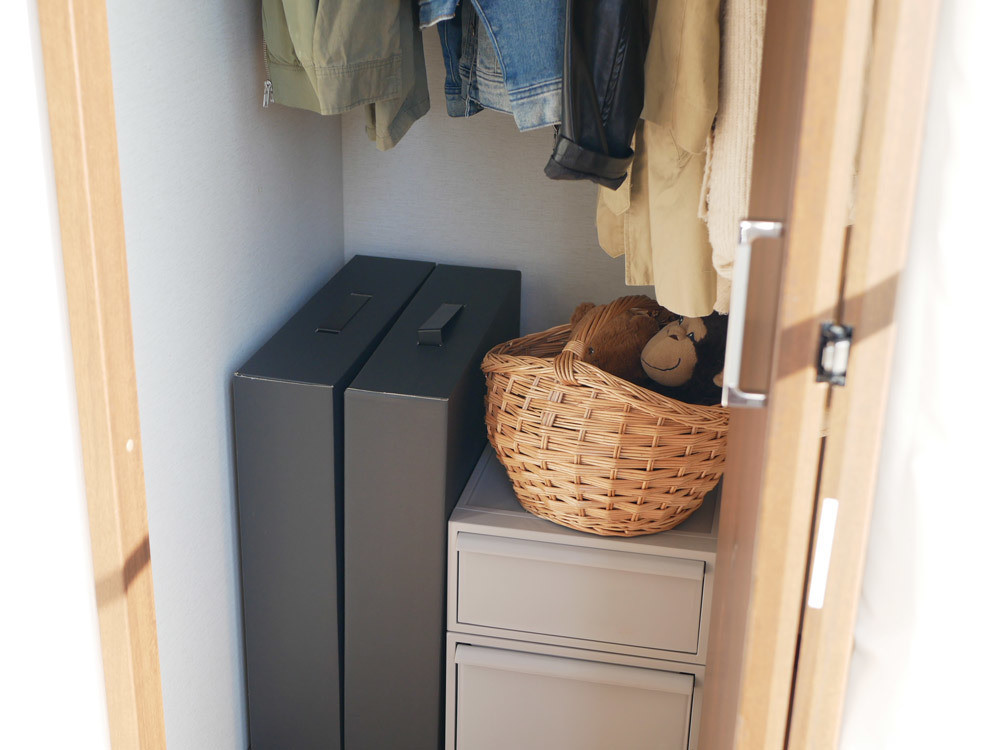 スリムで省スペースな「作品収納ボックス」は、奥行きのないクローゼットにも収納OK!