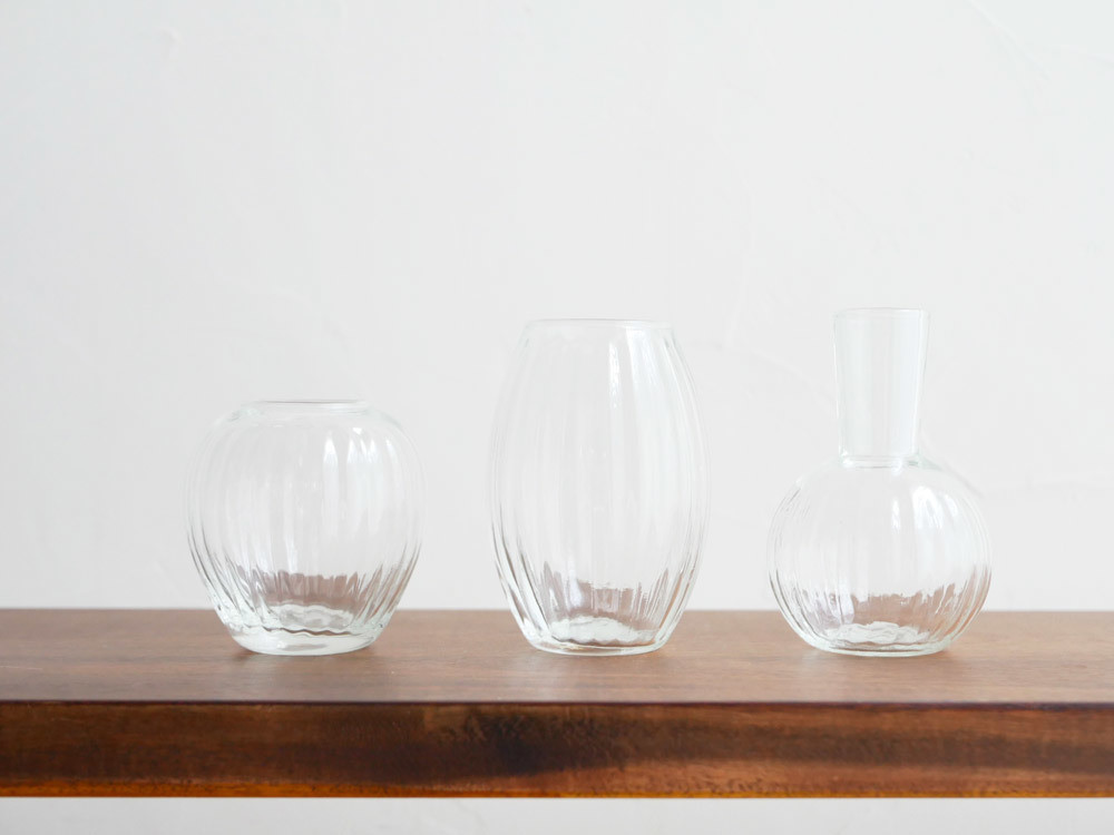 どれもコロンとした丸いフォルム。視覚的に癒され、ガラスの透明感で心まで洗われるように清々しい気持ちに誘われる、花瓶。