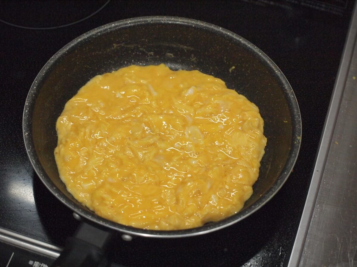 しかし小さめのフライパンを使えば、卵が広がらず厚みが出るので、半熟のふわふわ卵が作れるそうです! 私は今回、直径21センチのフライパンを使用しました。