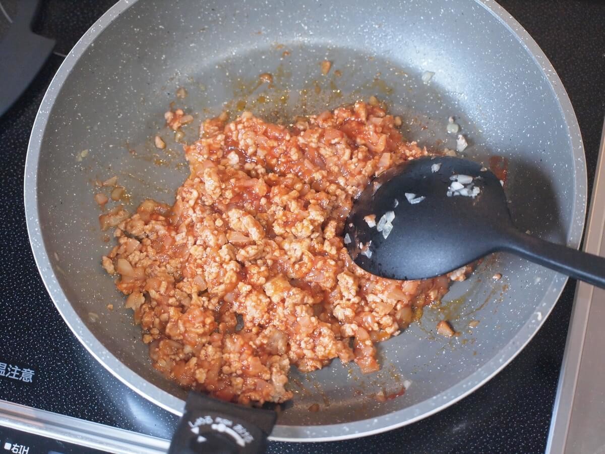ごはんを入れた後ケチャップを入れてしまうと、ケチャップが具に絡みにくく、加熱時間が増えてベチャッとする原因になってしまうのです。