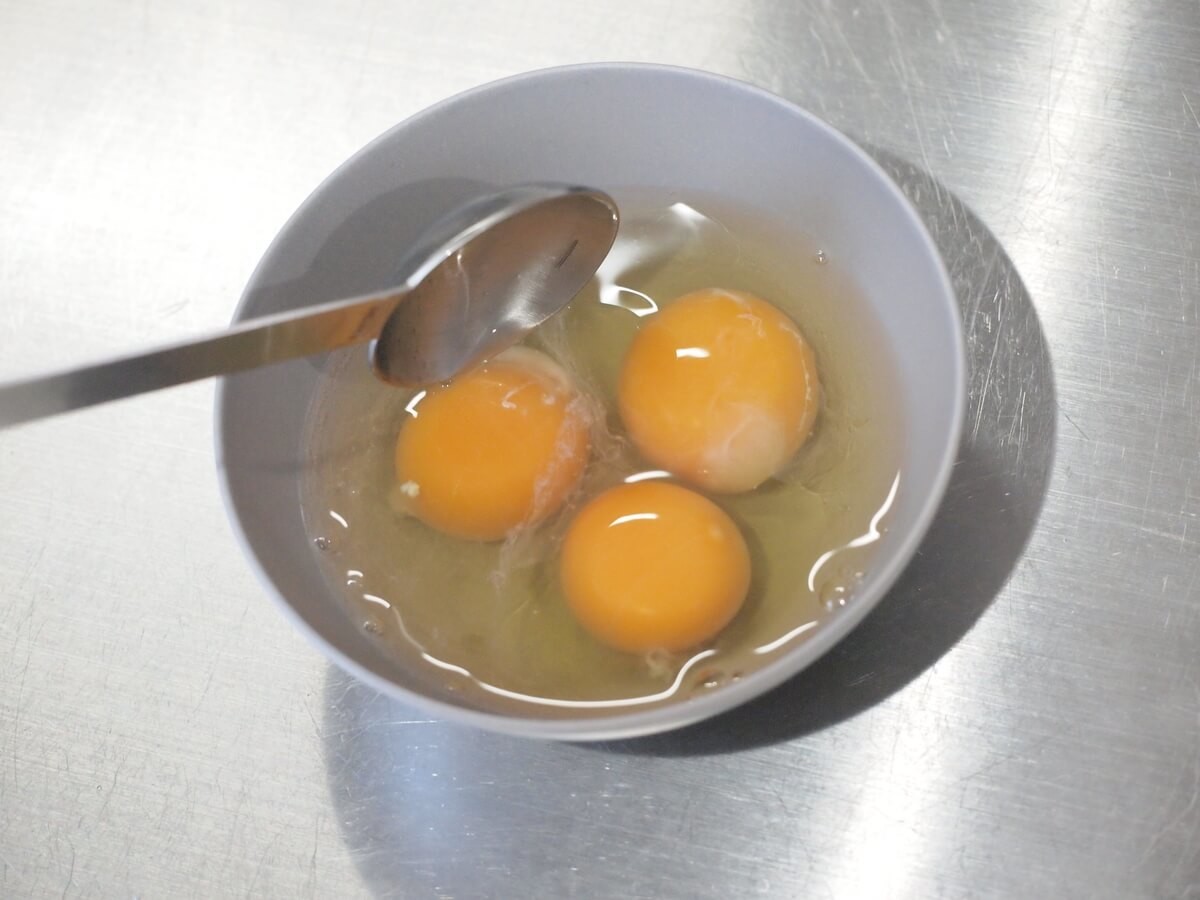 次は卵に「炭酸水を加える」こと。炭酸水の気泡によって、卵がふわふわに仕上がります。