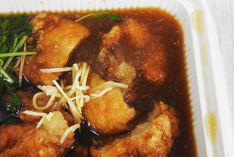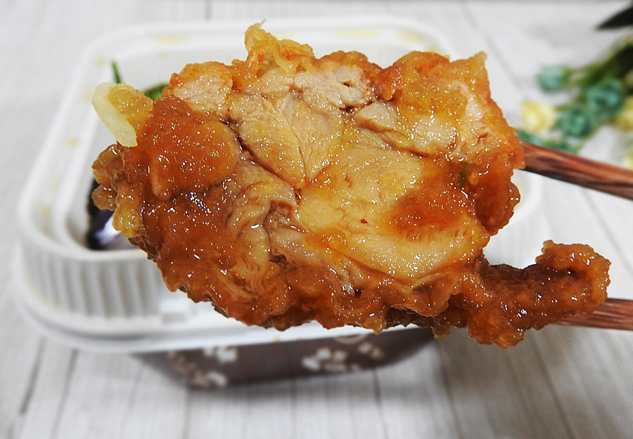 みぞれ煮弁当の中に入っている生姜からあげも例外ではありません。お箸で掴むのがやっと……!という位の重量感がありますね。生姜からあげは半分にカットされてはいるものの、それでも大きい……!