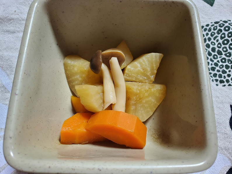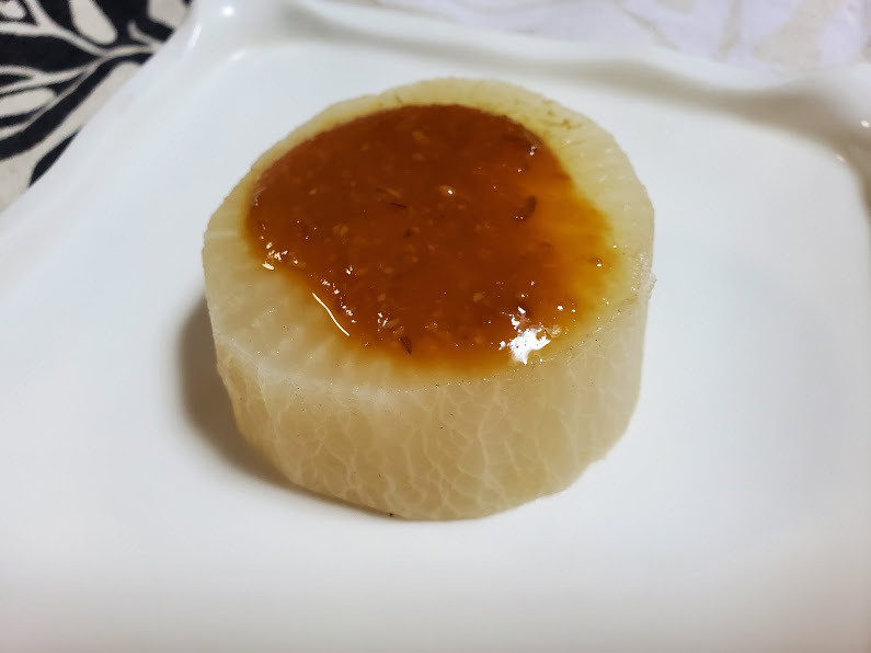 大根の中央部分の繊維が壊れているからか、中は"ふにゃっと柔らかい"食感でした。短時間でも味がよく染みていて美味しかったです。