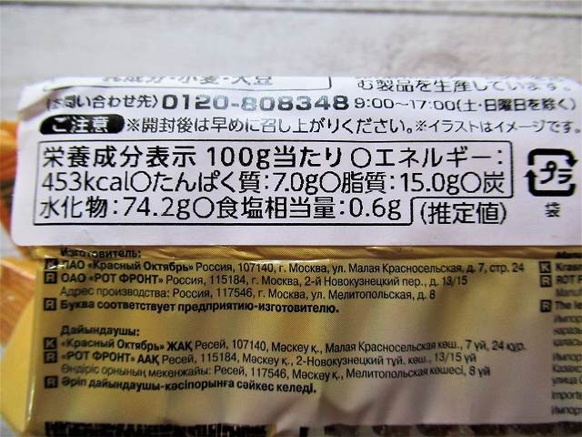 栄養成分100gあたり:エネルギー460kcal/たんぱく質7.5g/脂質16.0g/炭水化物72.9g/食塩相当量0.6g