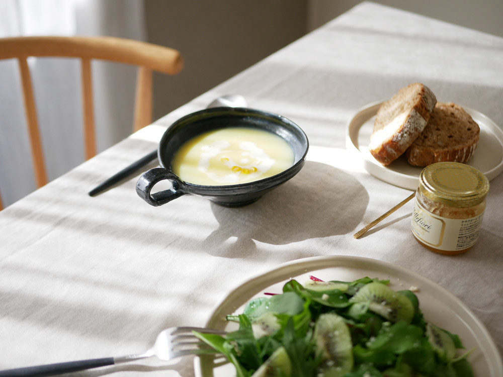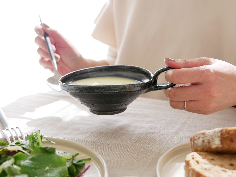 温かいスープも、取っ手があることで安心して持つことができますね。 指先1本入るハンドルでそっと持つ、その佇まいはいつものスープも隠れ家カフェのような、おしゃれな空間を演出してくれます。