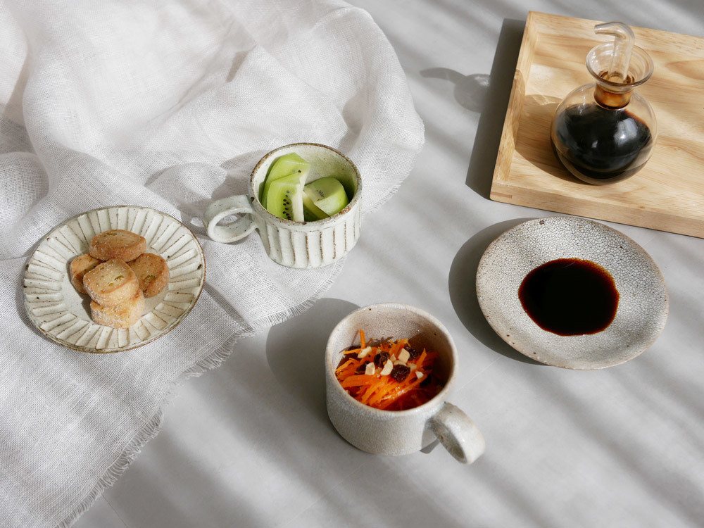 自然の風合いでシンプルな器は、コーヒーカップの他に副菜や醤油皿、フルーツやお菓子などの器としても。