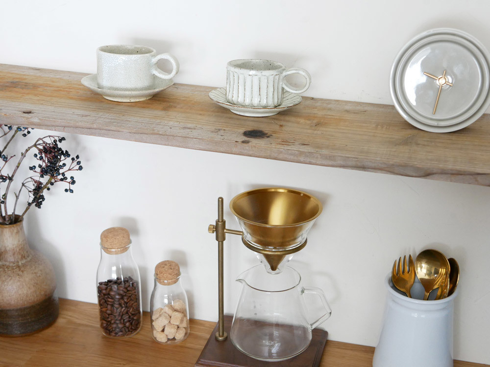 棚から取り出し、「コーヒー碗と丸皿」にゆっくりとコーヒーを淹れる。