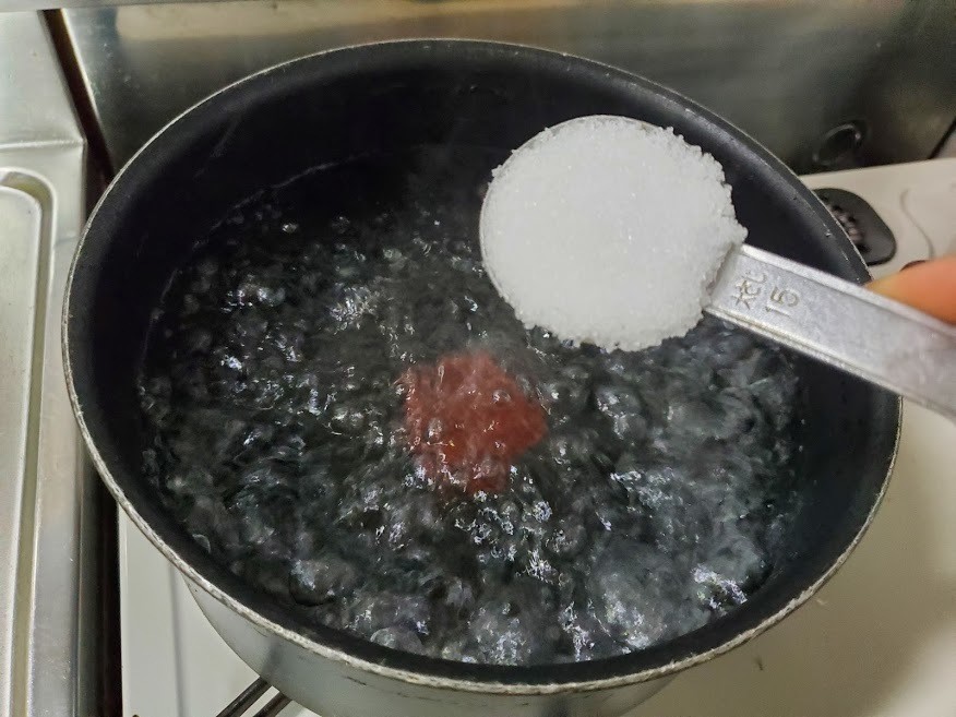 鍋にたっぷりお湯を入れて沸かし、水に対して0.5~1%を目安に塩を加えます。(※今回は1500mlのお湯に対して、大さじ1/2~1弱の塩を加えました。小ぶりのものなら大さじ1/2程度、かなり大きいものなら大さじ1強でもいいかもしれません)