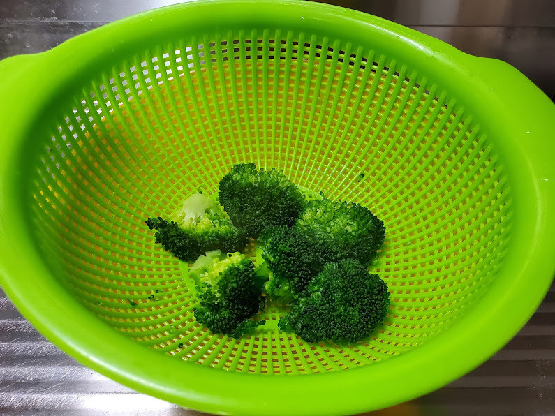 ブロッコリーを鍋からざるに上げた後、すべてのブロッコリーの花蕾を上向きにして、冷めるまで数分間置きました。