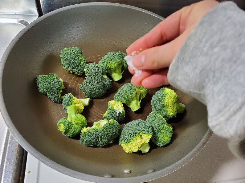 小房に分けたブロッコリーをフライパンに入れ、ひとつまみの塩をふりましょう。