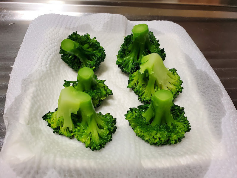 こちらはブロッコリーを一旦、鍋からざるに上げた後、キッチンペーパーを敷いたお皿の上に花蕾を下向きにして数分間置き、冷ましました。