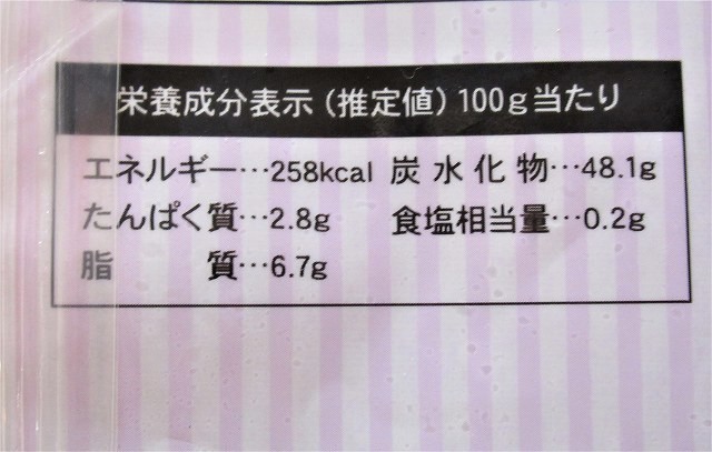 栄養成分表示100gあたり:エネルギー258キロカロリー/たんぱく質2.8g/脂質6.7g/炭水化物48.1g/食塩相当量0.2g