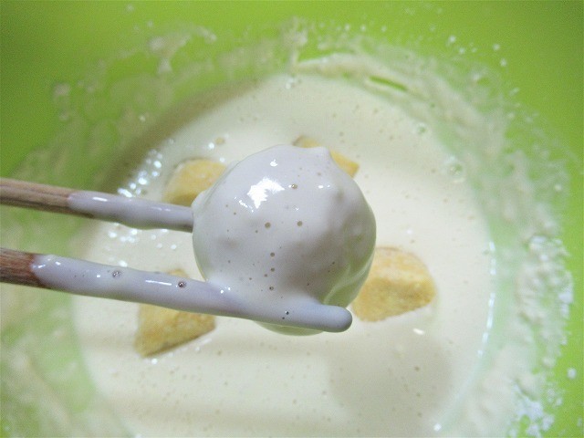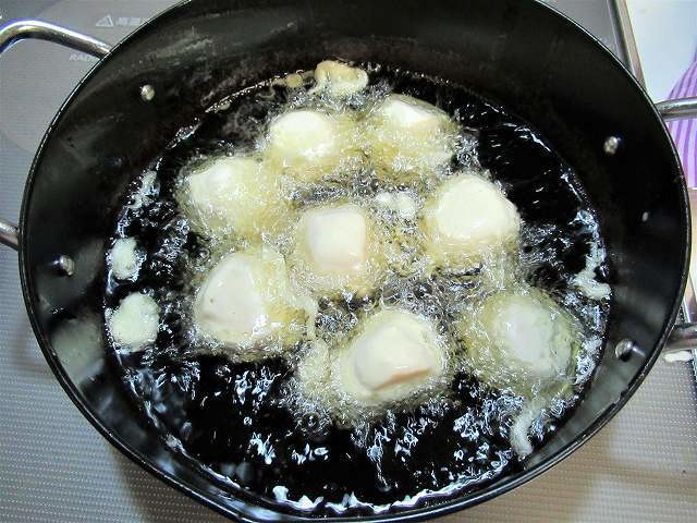 凍ったままのスイートポテトを衣にしっかりとくぐらせて、175℃くらいの油で揚げる。