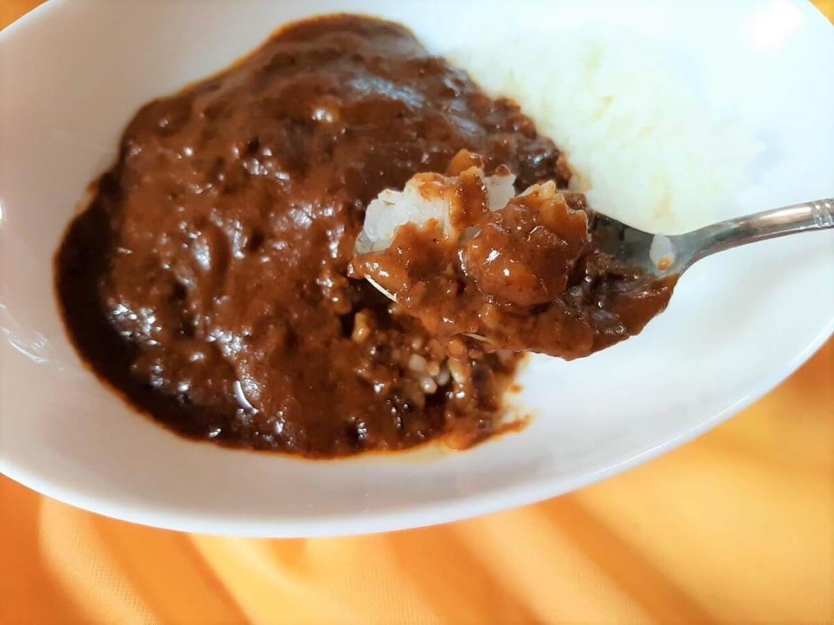 しっかりした濃いめのカレーなので、目玉焼きなんかをトッピングしたらまろやかさが加わってもっとおいしくなるかも……!