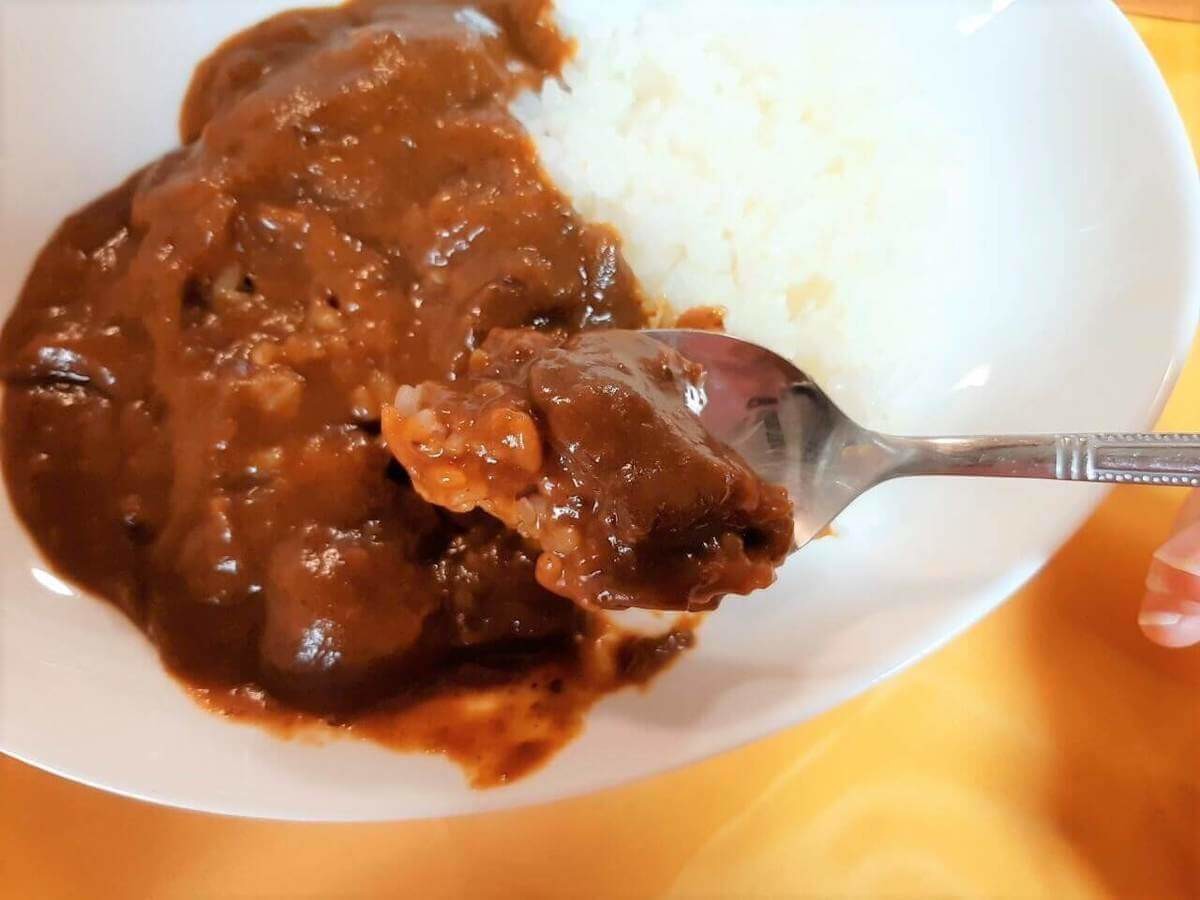 ルーは私の感覚では中辛くらい。肉の旨味が口いっぱいに、そして後からスパイスの香りと刺激が広がります。 サラッとしているというより、濃厚でドロッとしたルーでした。