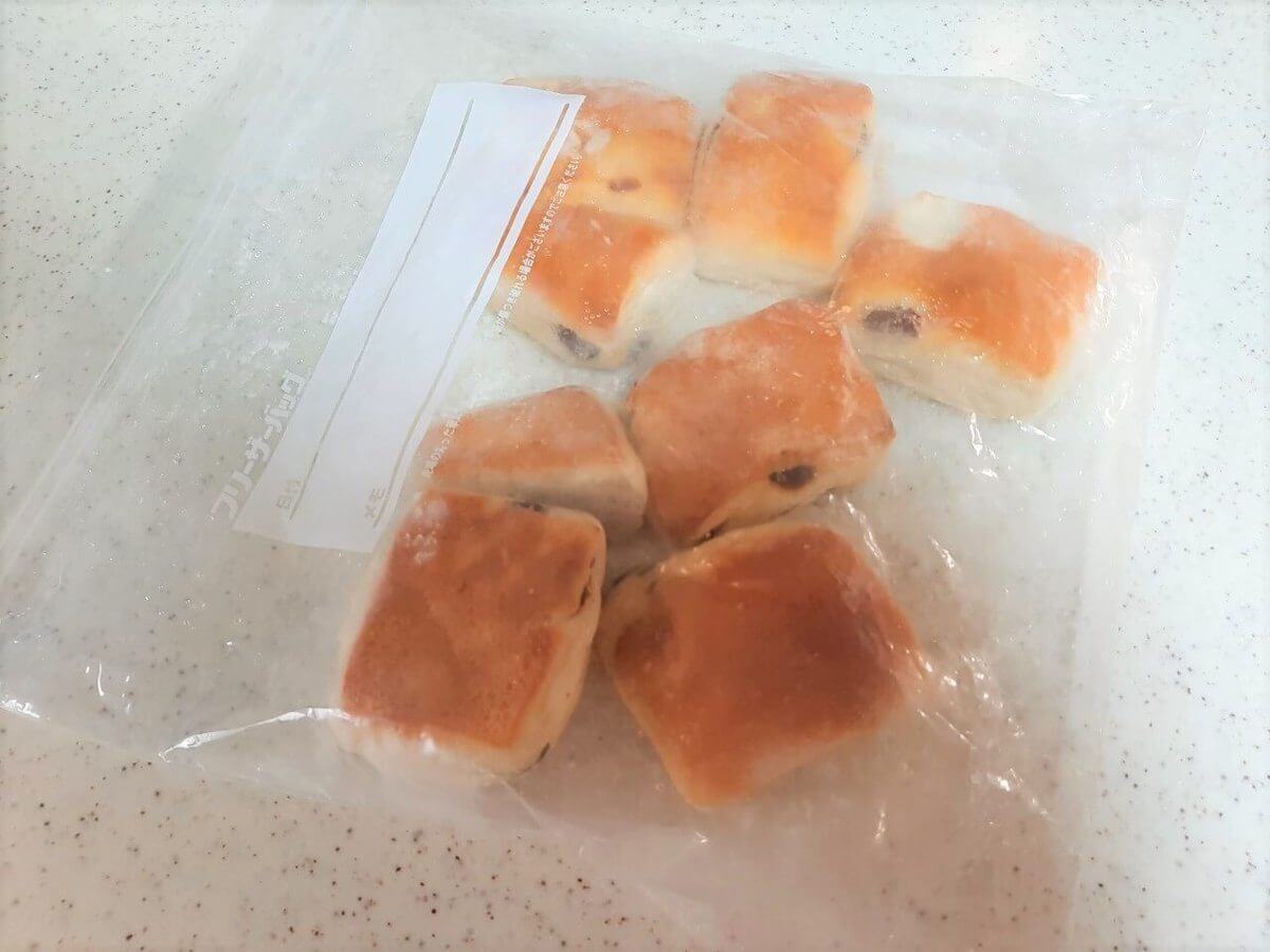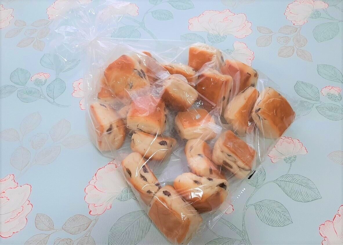 冷凍のままトースターで焼き色が付く程度に温めれば、もちもちしっとりのレーズンパンが楽しめます。
