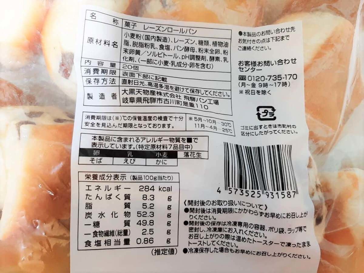 レーズンロールパンは20個入り。298円なので1個約15円です。