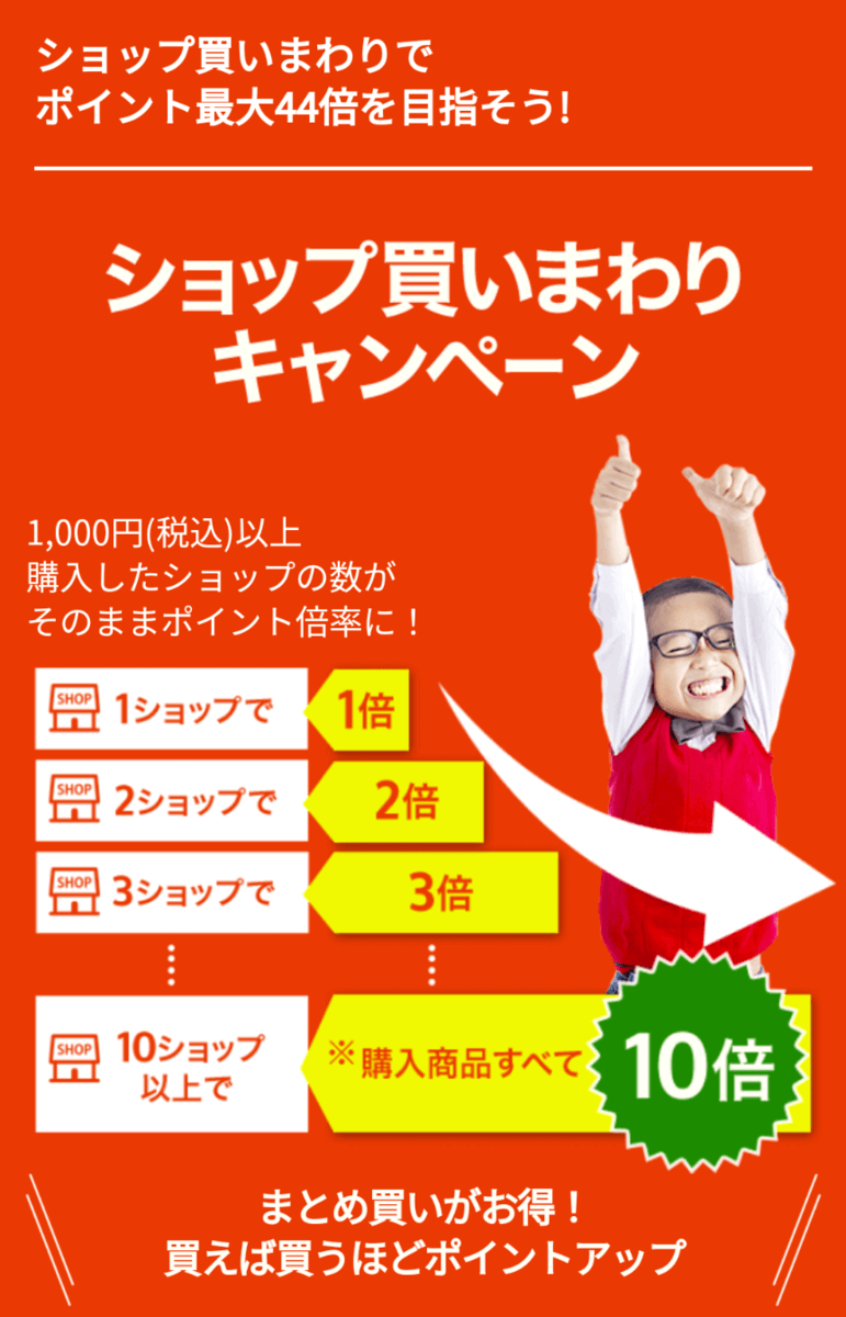 ポイントの上限は最大10倍ですので、10店舗でお買い物すれば購入商品がすべて10倍になります。 ただし、1店舗の購入金額が1,000円以上(税込)でないと対象になりません。
