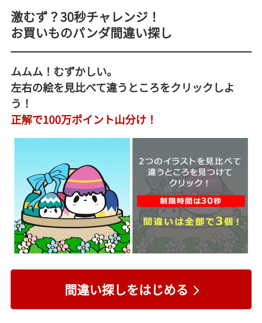 こちらは30秒の時間制限内に答えを当てると、正解者を対象に100万ポイントが山分けされる「お買いものパンダ間違い探しで100万ポイント山分けチャンス」。 激ムズと噂の間違い探し、ぜひこちらもお買い物マラソン中に参加してみてはいかがでしょう。