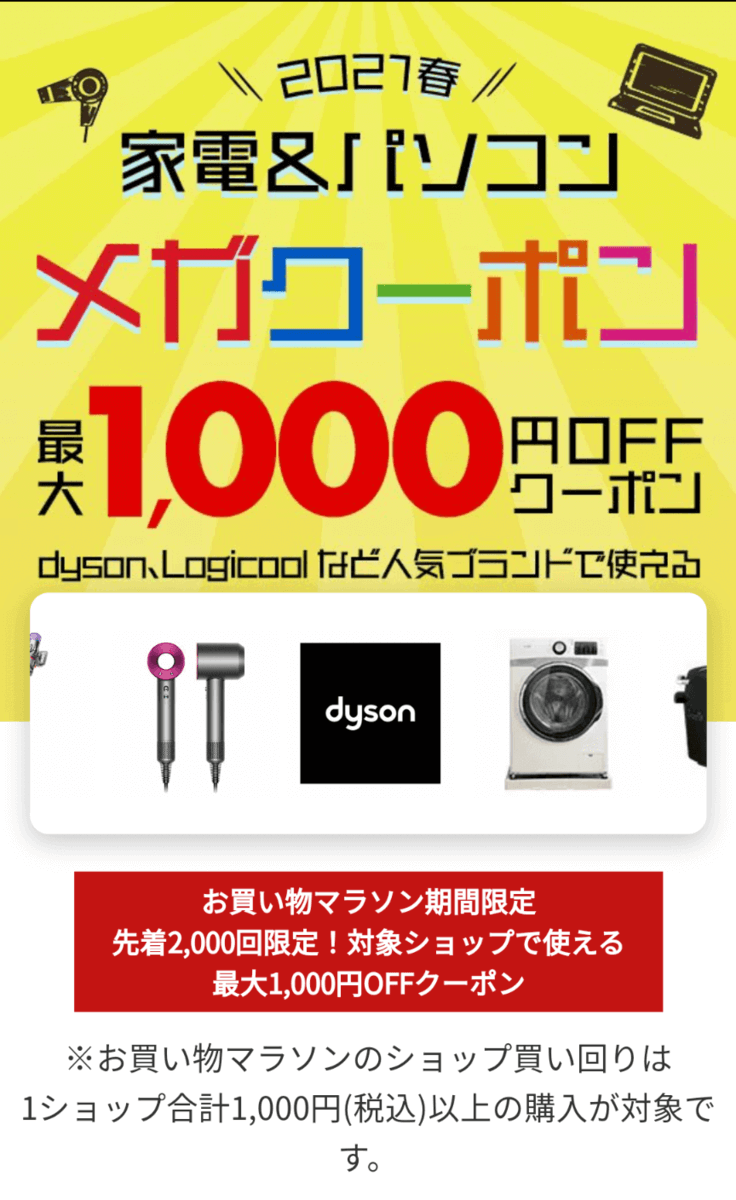 楽天お買い物マラソン中に、家電を購入しようかなと思っている方に朗報です! 今なら最大1,000円オフになる「メガクーポン」をゲットすることができます。