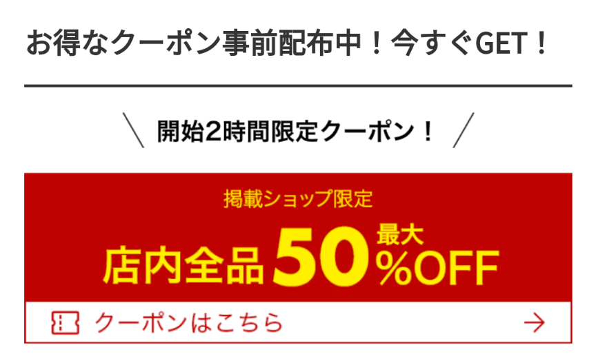 事前にゲットしたおきたいのが、楽天お買い物マラソンのスタート直後しか使えない2時間限定クーポン。 最大50%オフのとってもお得なクーポンですので、忘れないよう事前に入手しておくことをおすすめします。