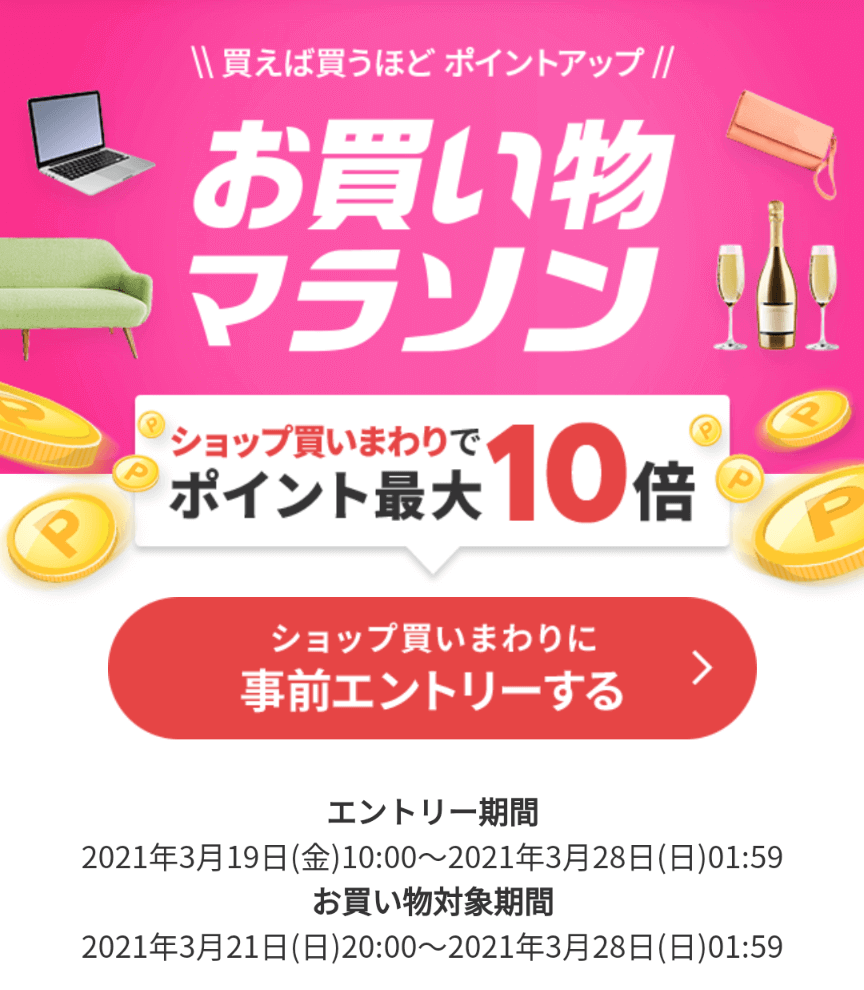 次回の楽天お買い物マラソンの開催期間は、〝2021年3月21日(日)20:00~2021年3月28日(日)01:59〟です。 参加するためにはエントリーが必須であり、事前または開催中であればいつでも参加できます。