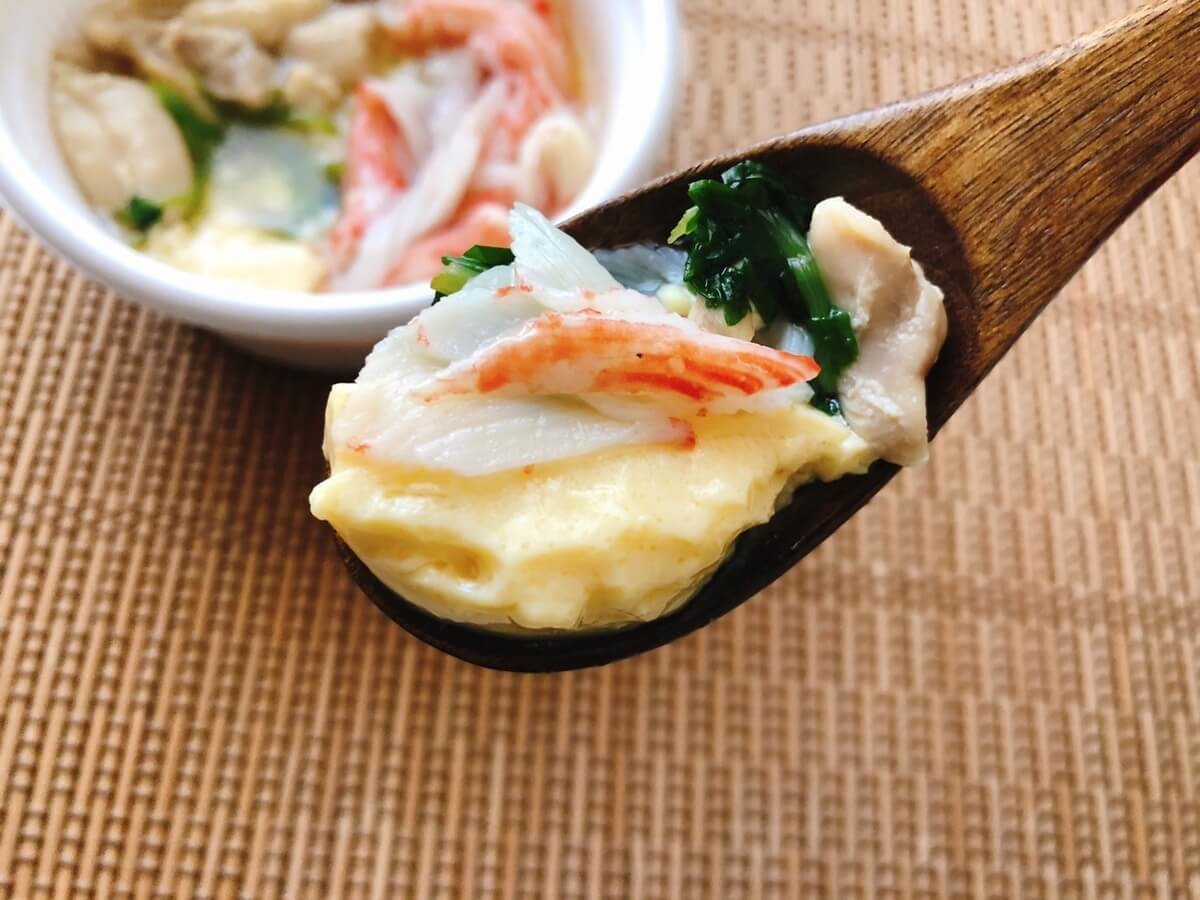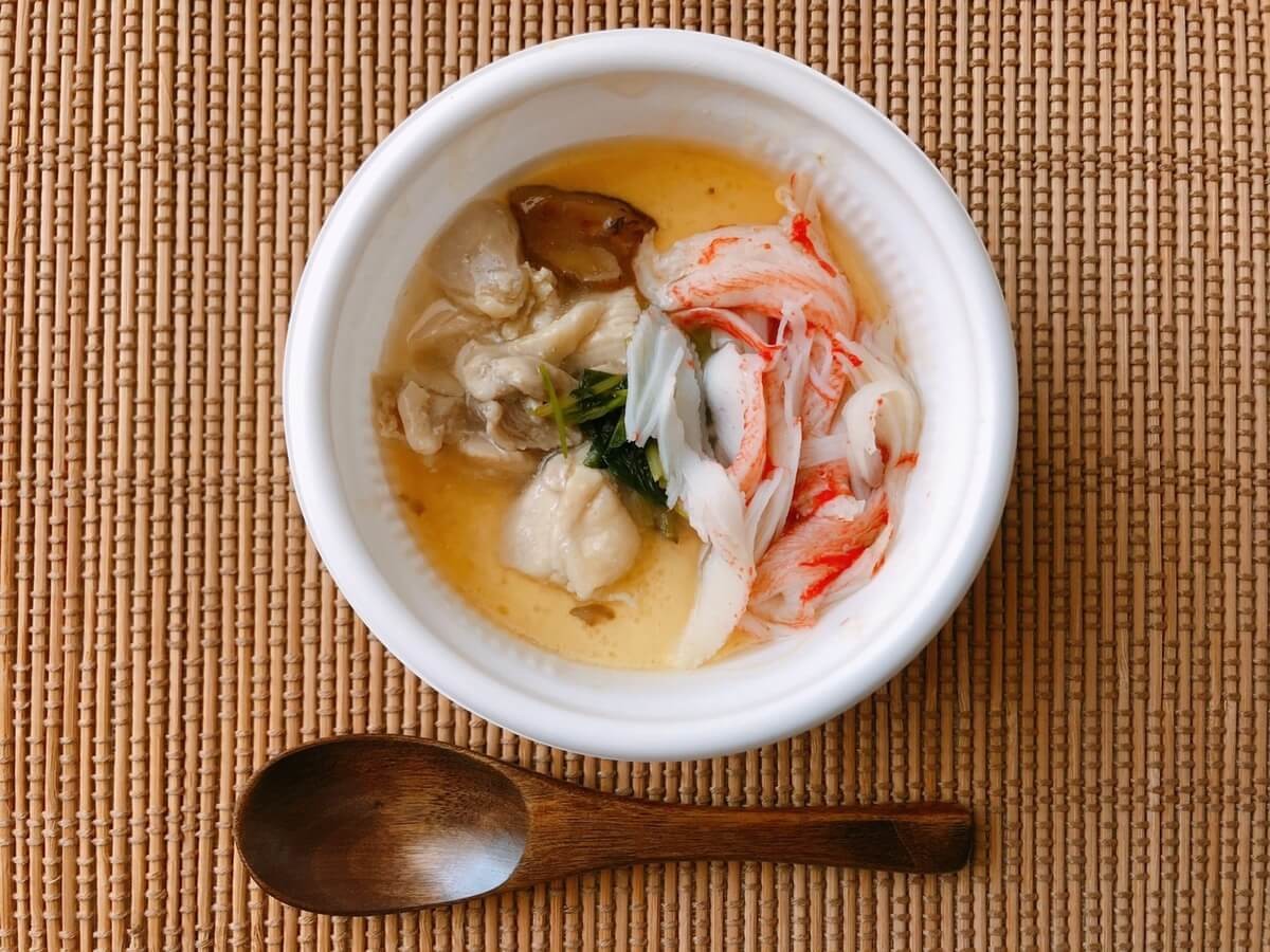 「茶碗蒸しで300円は高い……。」と思っていましたが、実際に買ってみると食事のメインに置き換えられそうなほどボリュームがあり、香り箱(カニカマ)や鶏肉、三つ葉に椎茸など具材がたーっぷり贅沢に乗っています。
