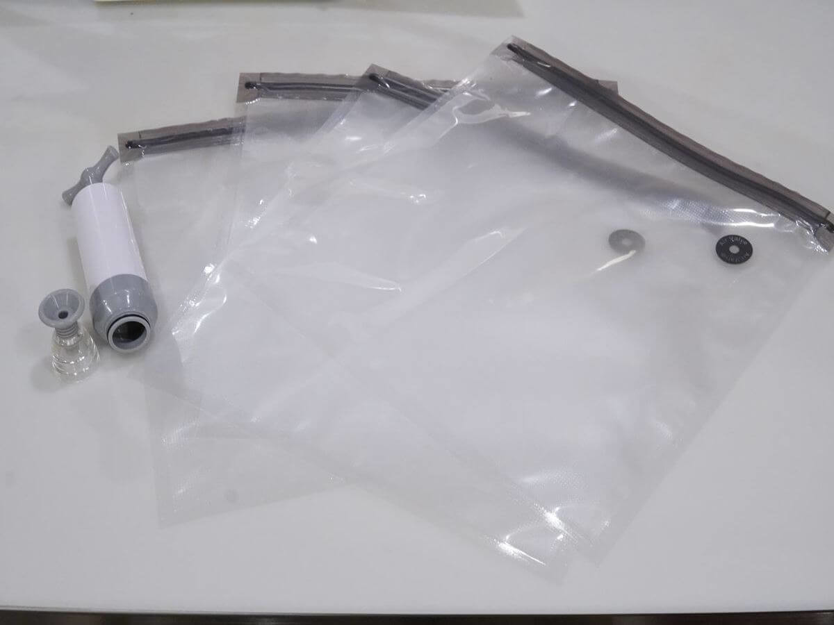 しっかりした素材のフリーザーバッグ3枚と、真空に出来るポンプがセットになっています。
