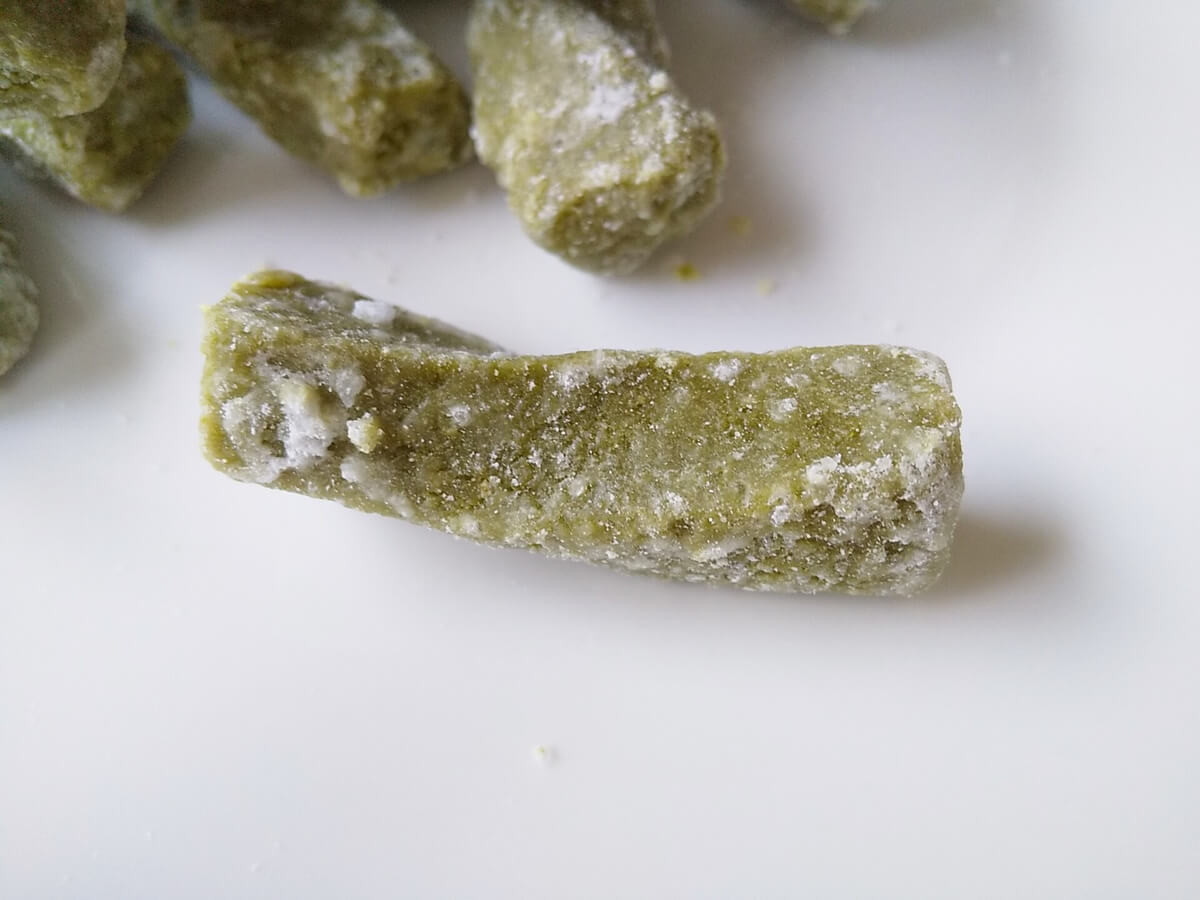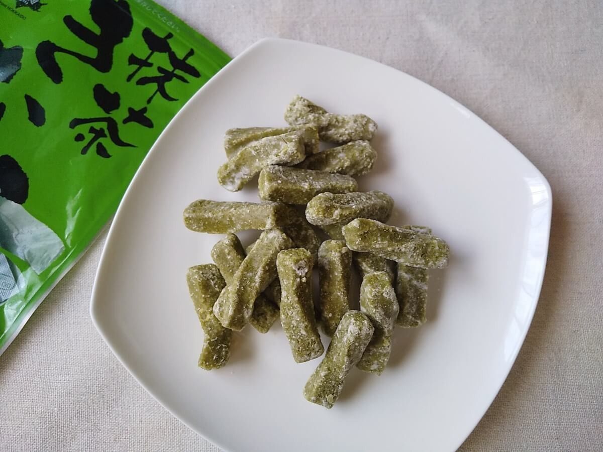 緑色にお砂糖の白色が映えて、見た目も上品ですね。和菓子っぽい雰囲気です。 苦そうな見た目ですが、お砂糖による甘さはちゃんとあるのでご安心を。