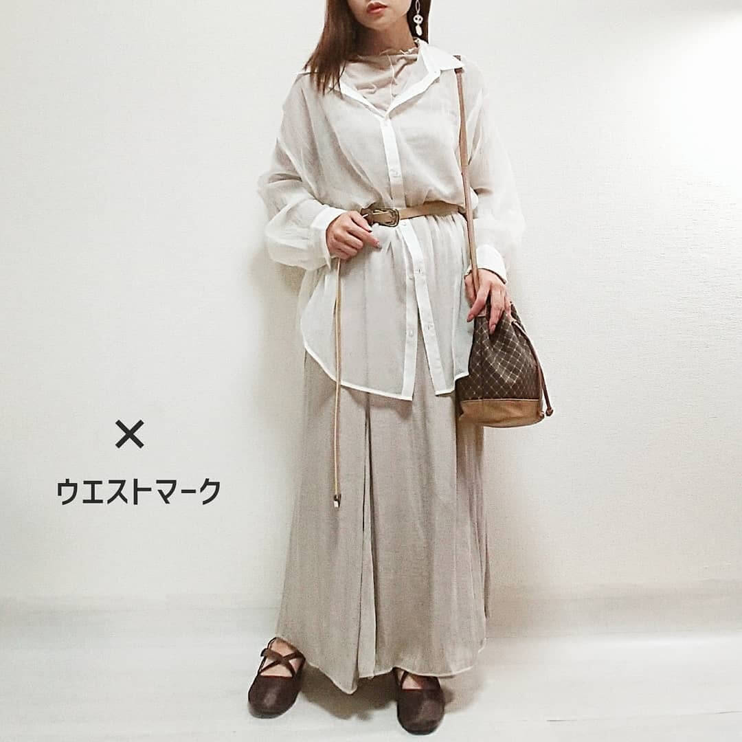 タックインしてもありですが、ロングスカートやボリュームパンツならウエストをベルトマークでスッキリ見せさせましょう。