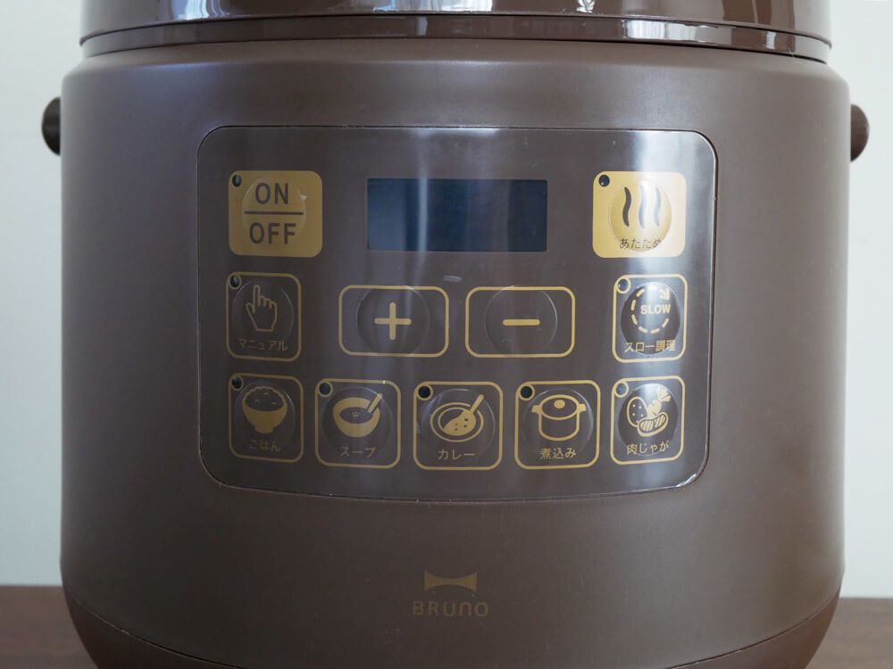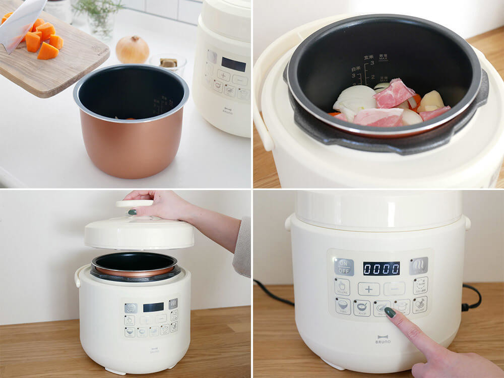 「BRUNO マルチ圧力クッカー」は、5種類の基本料理(ごはん、スープ、カレー、煮込み、肉じゃが)をワンタッチボタンで調理できるので、圧力鍋が初めての方にも安心。