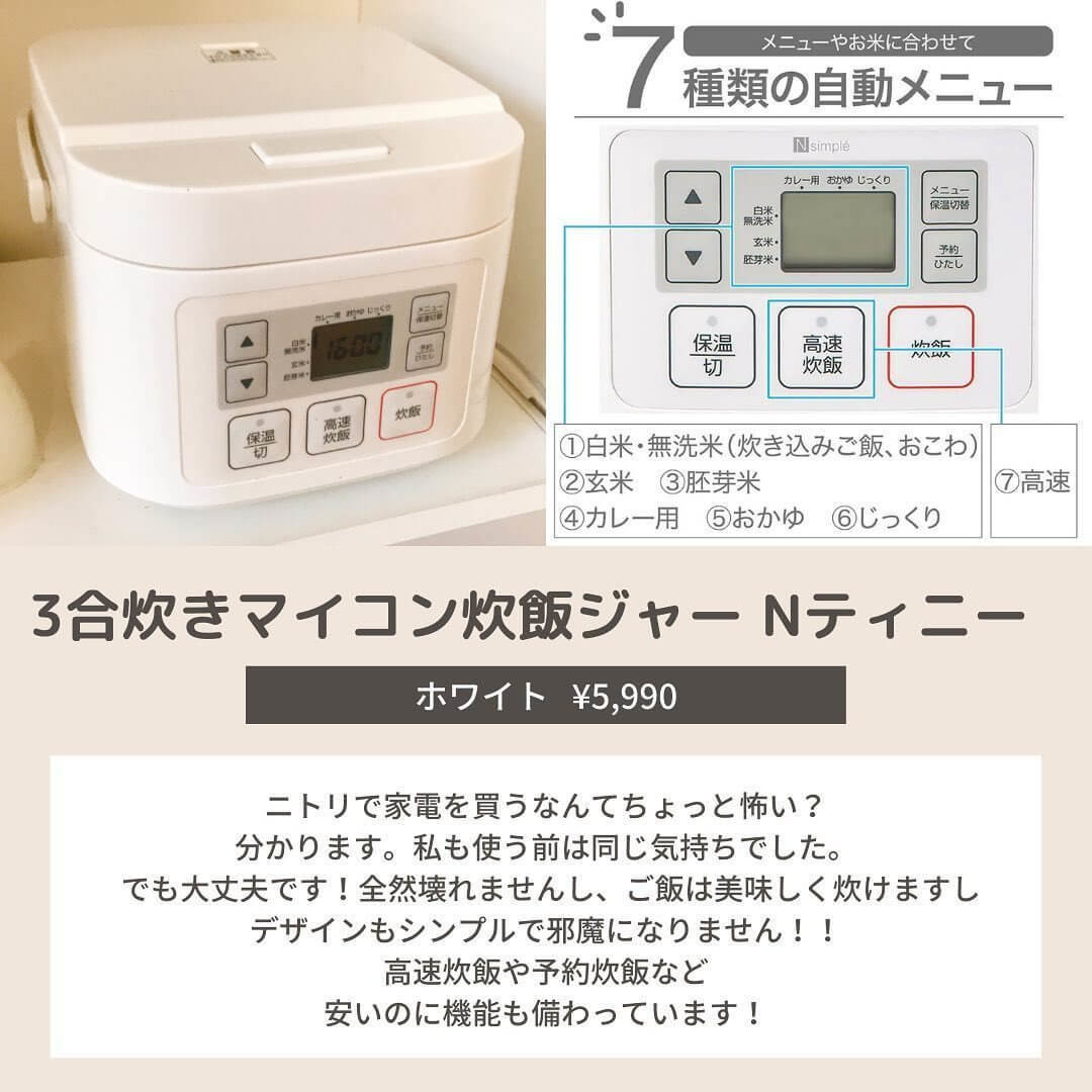 ニトリで家電を買うのが少し怖かったという@mikotonokurashiさん。「ご飯は美味しく炊けるし、デザインもシンプルで邪魔にならない」とのこと。
