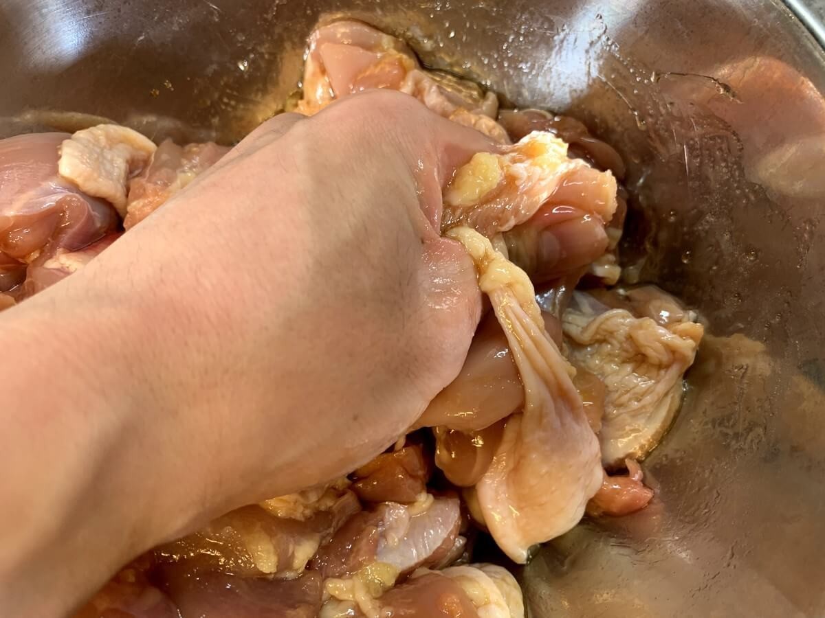 唐揚げを絶品に揚げるテク①繊維を壊すように揉み込む