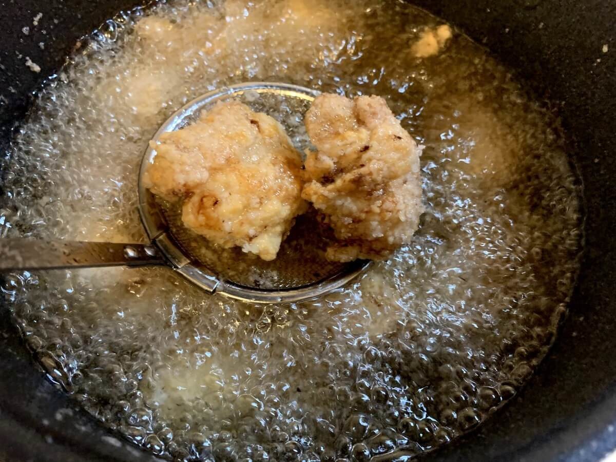 揚げている最中から、ふわっと唐揚げのいい香りが部屋中に広がります。皮で包んで揚げているので、お店で出るような綺麗な円形に揚げることができています。