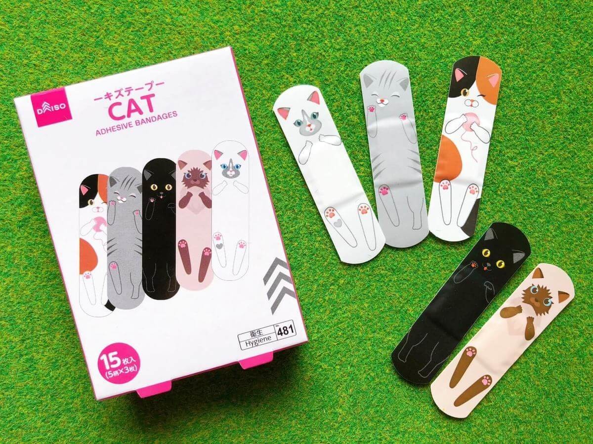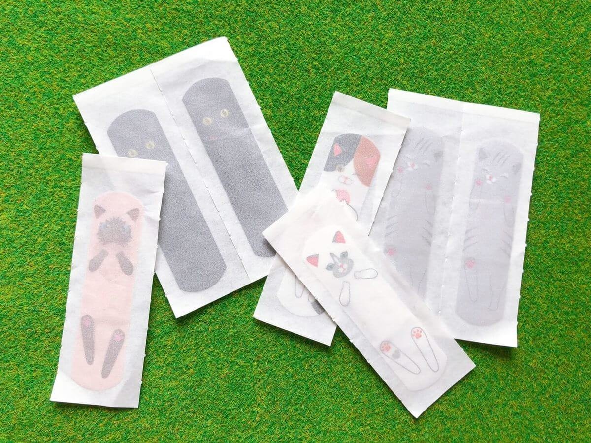 私が購入したのは猫ちゃん柄(15枚入)。5匹の愛くるしい猫ちゃんのキズテープが3枚ずつ入っていました。