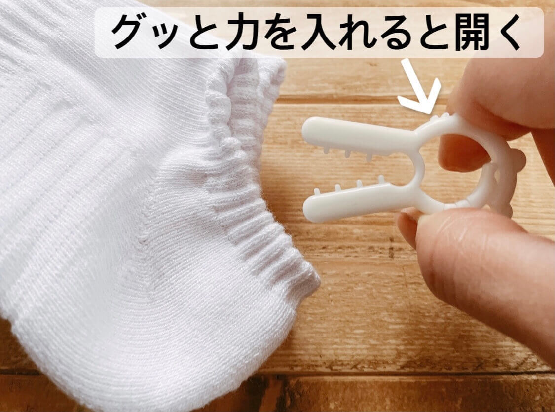 従来の洗濯バサミを開くときのようにグッと内側に力を入れると、洗濯バサミが開きます。開き方のコツを掴むと簡単ですが、慣れるまでは力の入れ方が難しいなと感じました。