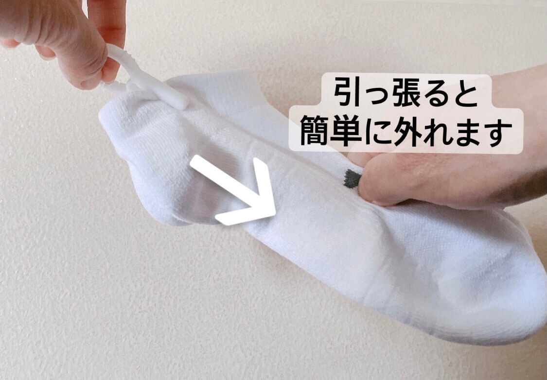 取り外す時は洗濯ばさみを持って靴下を下に引くだけで簡単に外れました。何度か使用しているうちに、ロックの外し方に慣れて、洗濯ばさみの開閉もしやすくなりました。