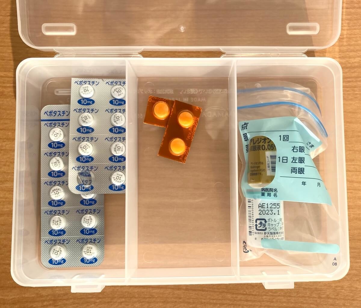 仕切られた3つのスペースがあり、それぞれ別の薬を保管できます。多少折れてしまいますが、目薬も入りました。