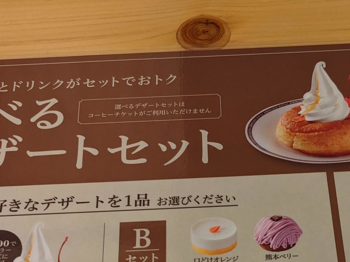 選べるデザートセット対象ドリンクは、コメダブレンド、アメリカン、カフェオーレ、アイスオーレ、豆乳オーレ、アイス豆乳オーレ、ミルクコーヒー、アイスミルクコーヒー、紅茶レモン・ミルク・ストレート(ホット・アイス)、アイスコーヒー、カフェインレスコーヒー、カフェインレスアイスコーヒー、ホットミルク、アイスミルク、コーラ、メロンソーダ、カルピス、コーンスープ