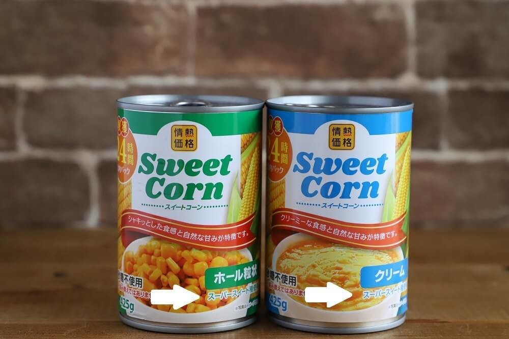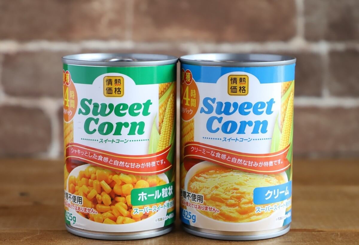 - 情熱価格 スイートコーン 左 ホール粒状 右 クリーム 各425g入 各98円(税抜き価格)