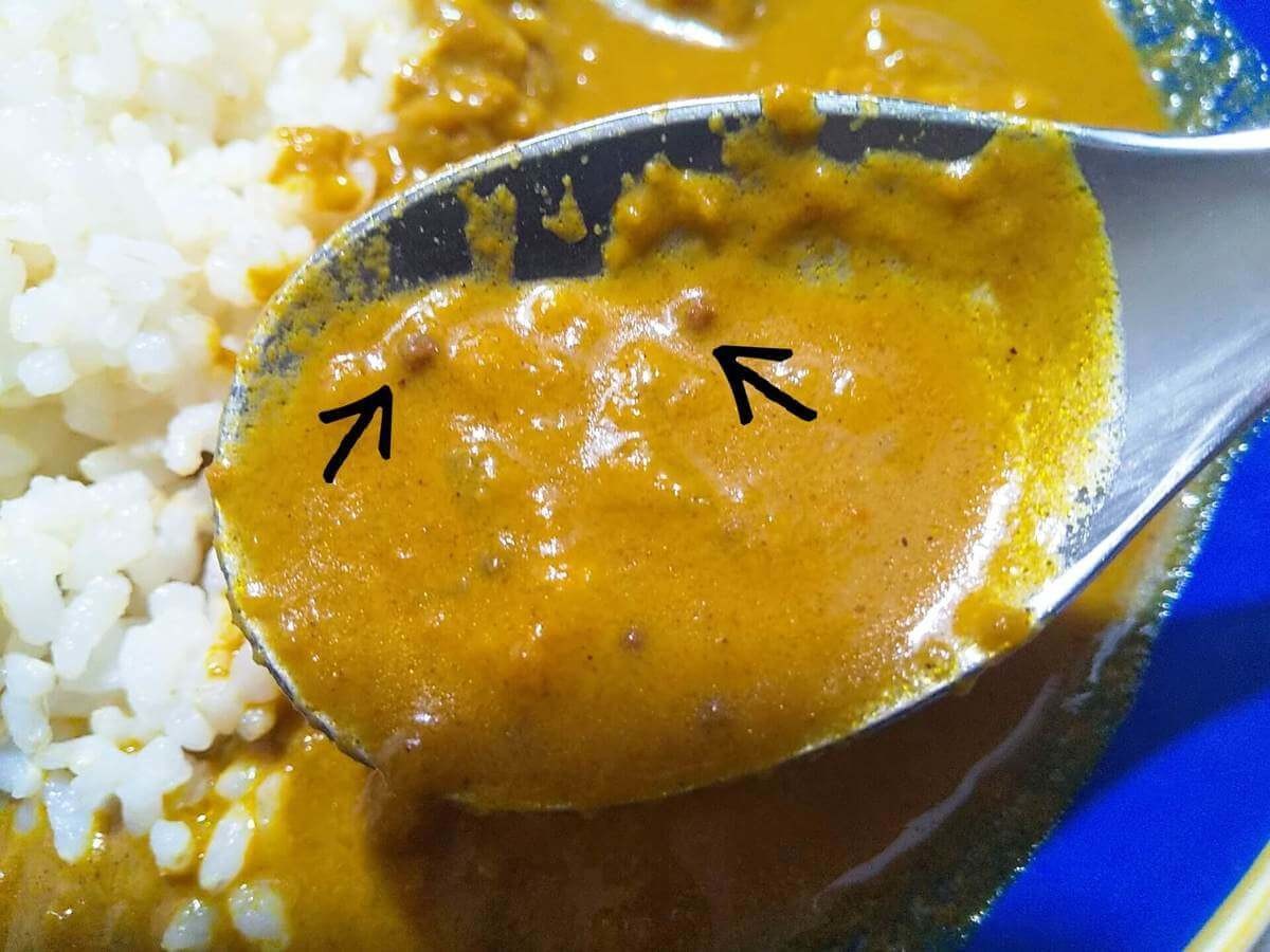 具材は大きめの鶏肉のみ。 肉汁がじわーっと系ではなく、淡白な味の鶏肉で少々物足りない……。 具材ではなく、カレー全体の風味を楽しむのが正解の商品です。